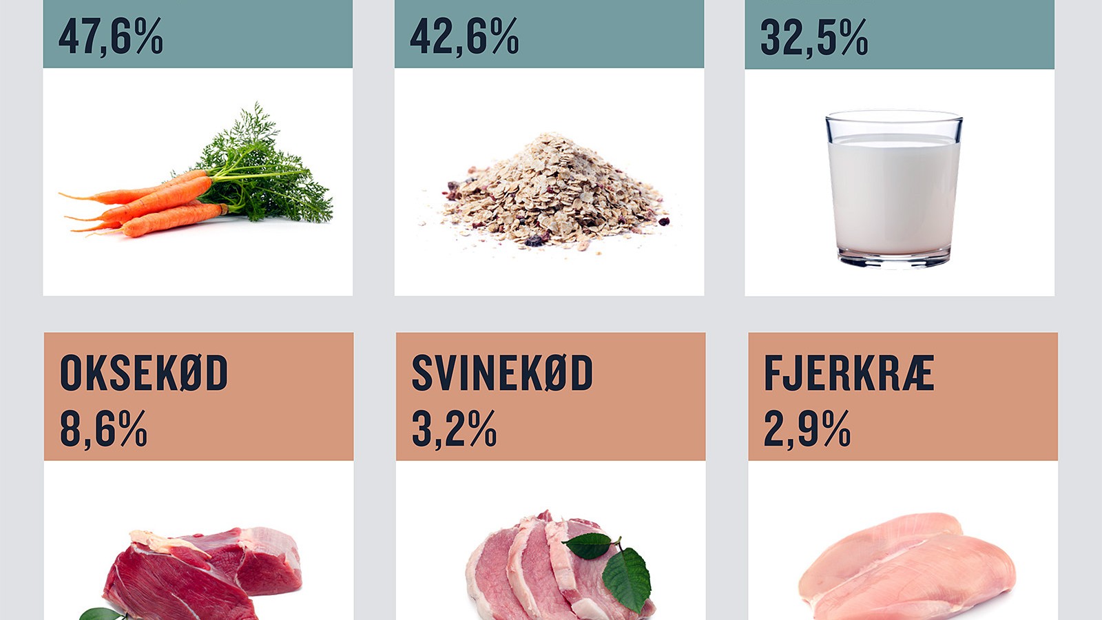Trods fremgangen er der stadig et stort gab op til økologiandelene for de mest populære økologiske basisvarer. Det er gulerødder, havregryn og mælk, som alle tre præsterer øko-andele, der allerede har krydset Økologisk Landsforenings 2030-mål om 30 pct. økologi, mens salget af økologisk grisekød og fjerkræ stadig halter langt efter, og Økologisk Landsforenings nye markedsnotat viser, at andelene for okse- og grisekød samt fjerkræ i 2018 alle lå under ni pct.