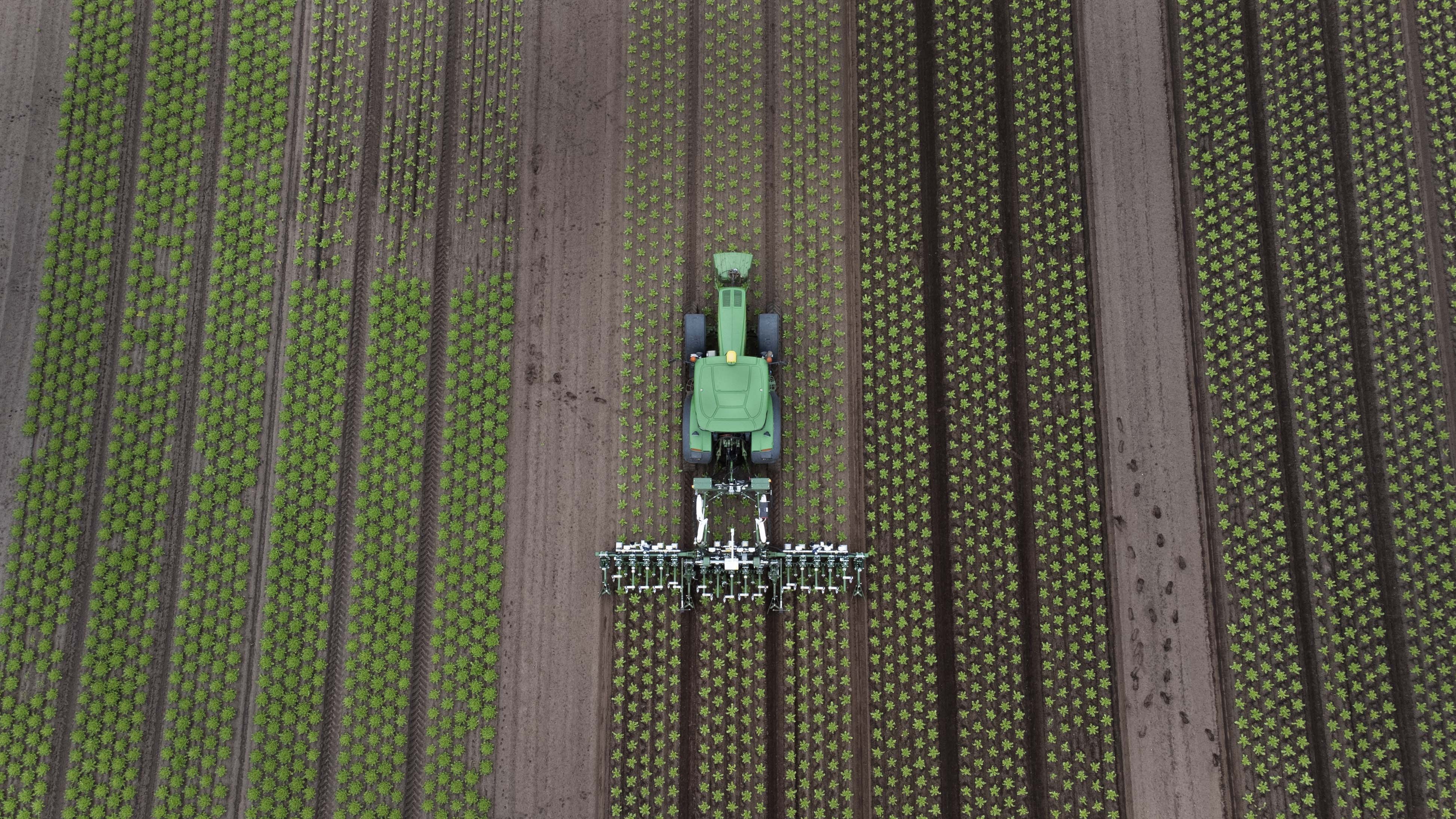 Som en lille grøn prik i endeløse rækker af økologisk frisee-salat sidder Modestas Kalvaitis omsluttet af teknologi på en stor John Deere traktor. Faktisk så meget teknologi, at han ikke behøver styre traktoren. Den kører på autopilot, mens Modestas kan følge de nyrensede salathoveder glide forbi på en computerskærm.